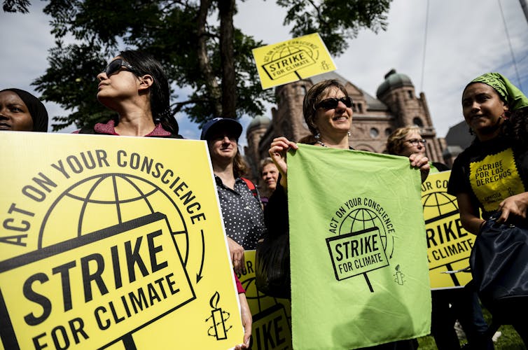 Amnesty International staff and volunteers gather at a climate change protest in Toronto in Sept. 2019. THE CANADIAN PRESS/Christopher Katsarov
