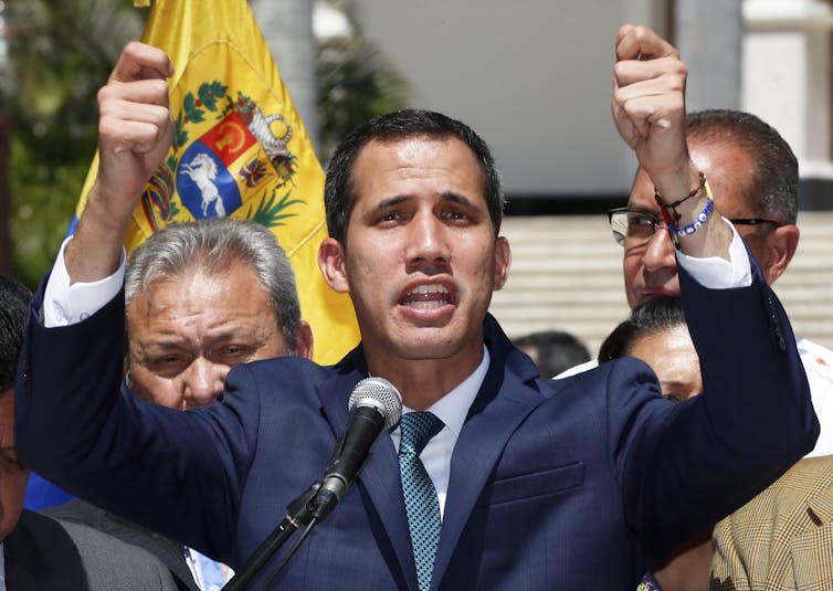 Opposition leader Juan Guaidó, outside the National Assembly in Caracas, Venezuela, Monday, Feb. 4, 2019. Germany, Spain, France, the U.K. and Sweden recognize Guaidó as the country’s interim president. (AP Photo/Fernando Llano)