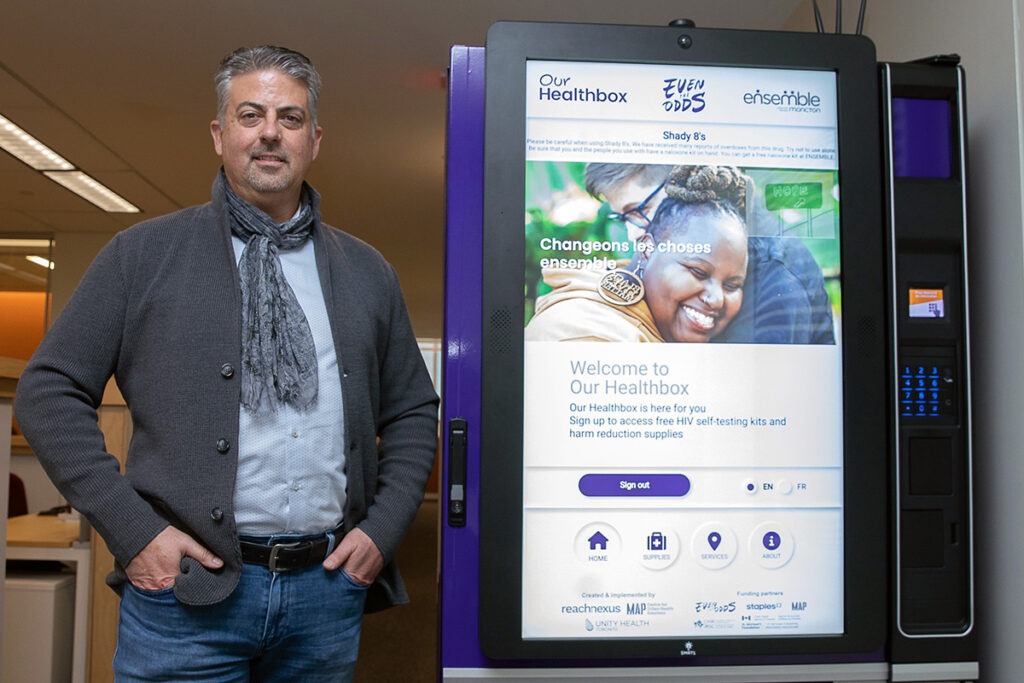 In 2023, that idea became Our Healthbox – a network of community-based vending machines offering free access to HIV self-test kits, naloxone, other harm reduction supplies, and other things we often take for granted that people need to take of their health.