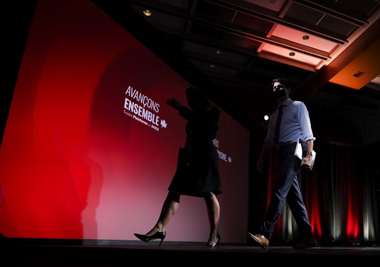 Liberal Leader Justin Trudeau, right, leaves the stage with MP candidate Chrystia Freeland after revealing his party’s election platform. THE CANADIAN PRESS/Nathan Denette